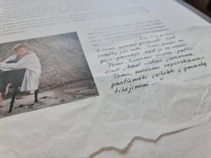 Būtent šis akcentas minimas ir parodos „Apkabinti save…“ autorės R. Vaičiūnienės žinutėje: „Esu tik žinutė kitoms sesėms priminti, kad nebūtų per vėlu. Toms, kurios nespėjo pasakyti, kad jos ne vienos. Toms, kurioms sunku – patvirtinti, kad viskas įmanoma. Toms, kurioms nepakeliama – pastūmėti įsikibti į parankę tikėjimui …“